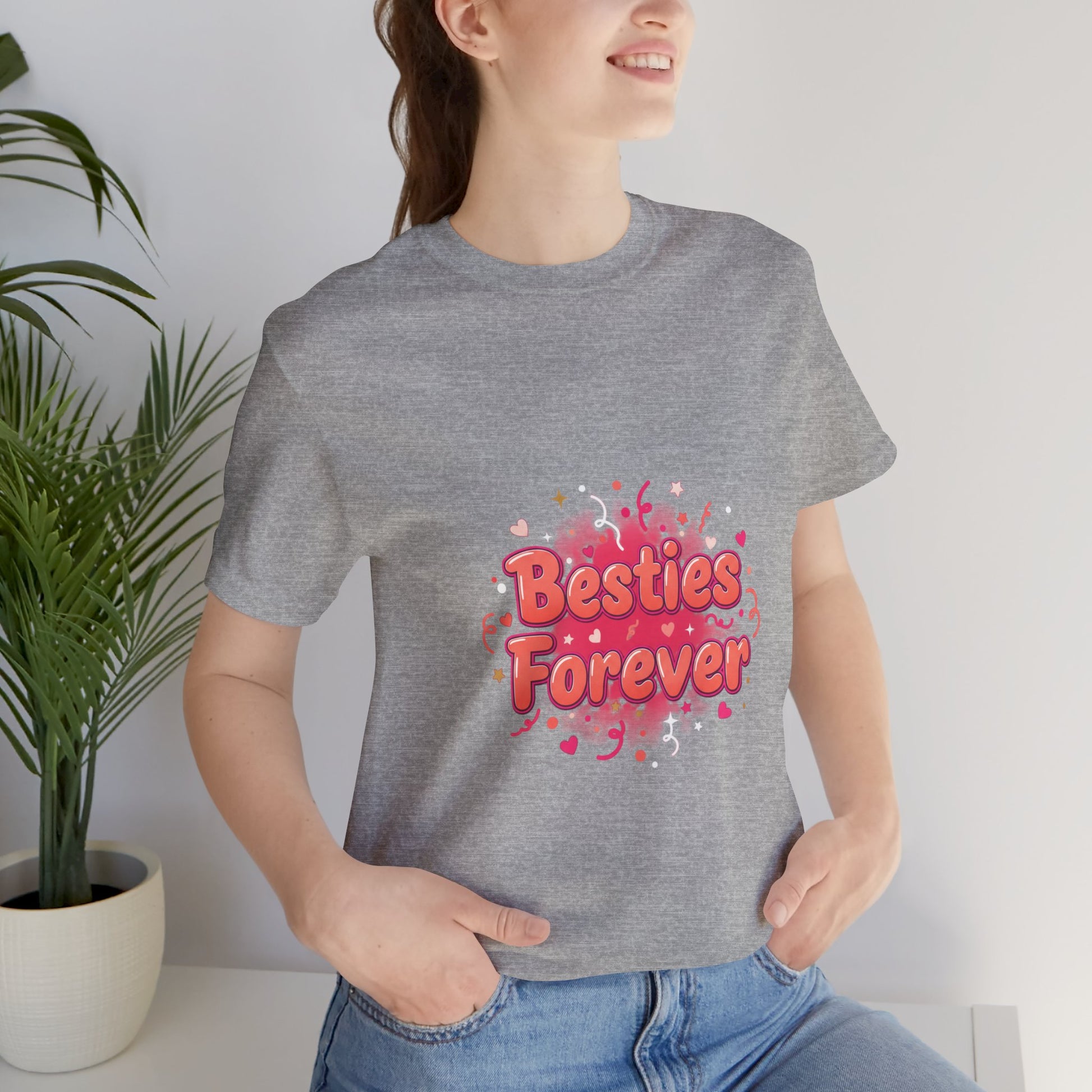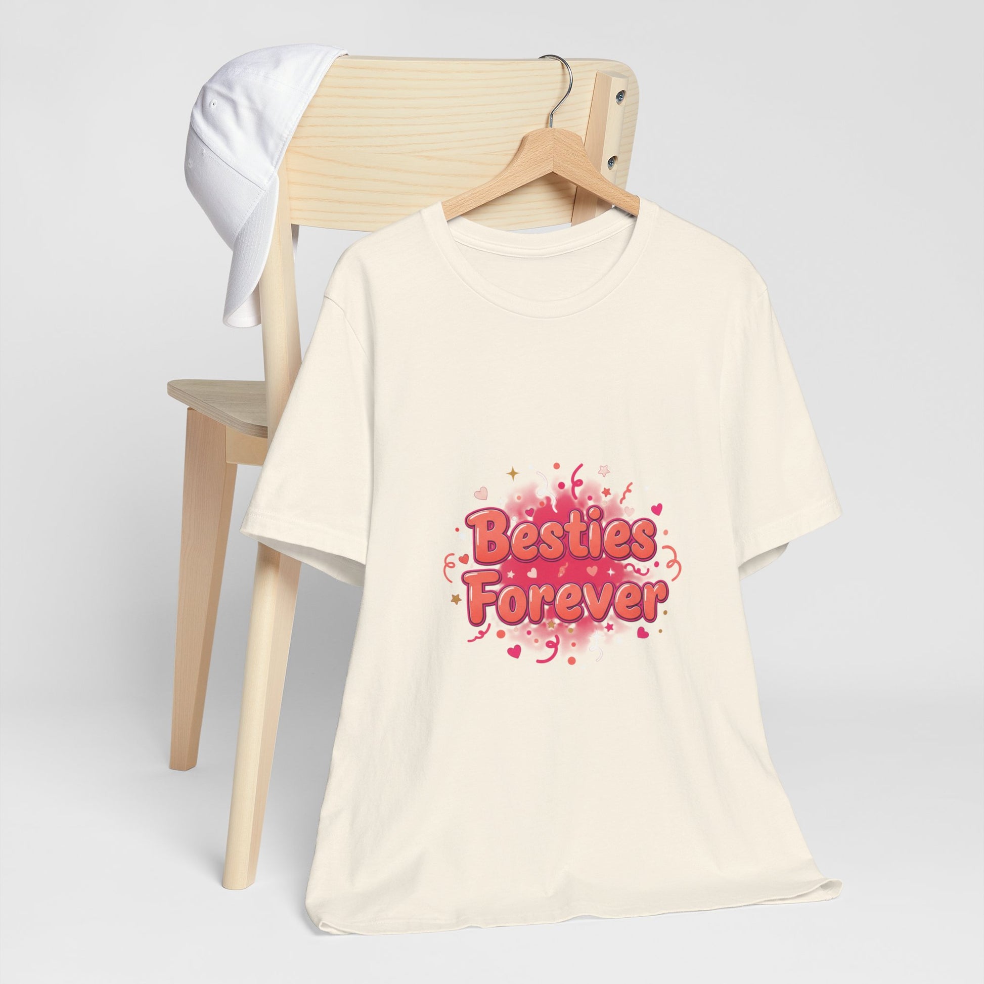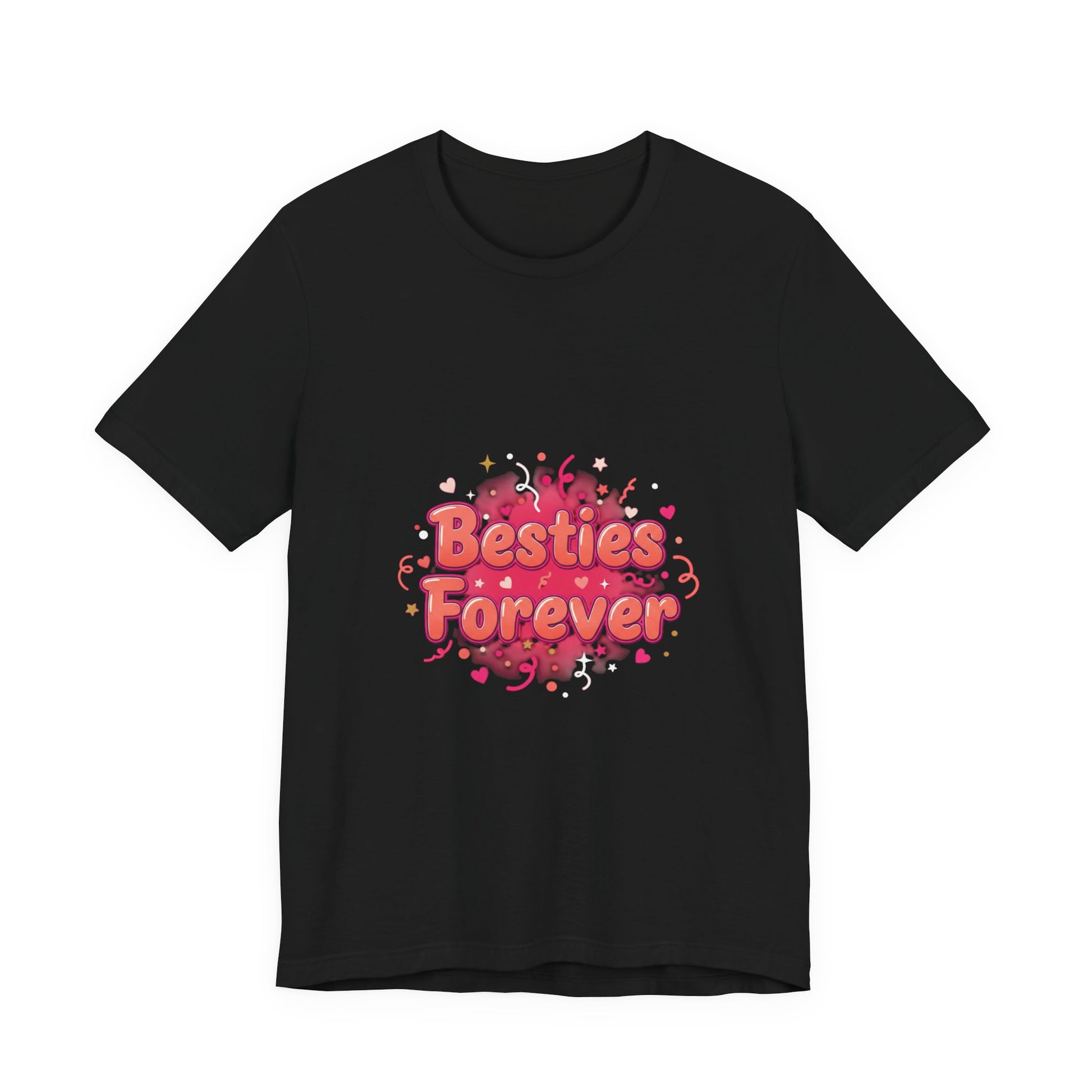 A bright, brunch-ready tee made for celebrating female friendship. Featuring a playful, script-style “Besties Forever”badge layered over saturated pink and coral watercolor splashes with confetti accents, this design captures the joy of Galentine’s energy—fun, supportive, and proudly friend-first (not romantic).