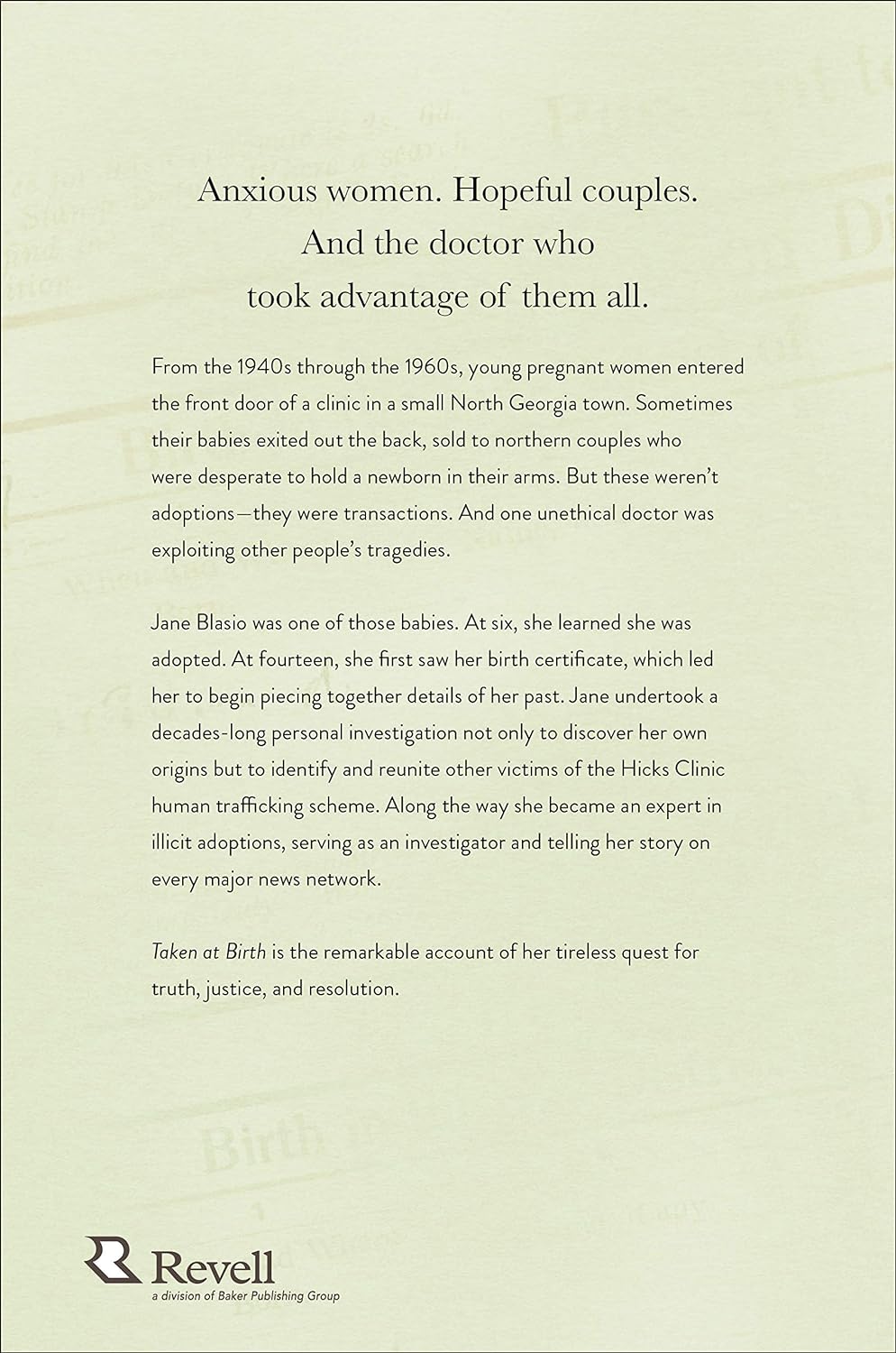 Anxious women. Hopeful couples. And the doctor who took advantage of them all. From the 1940s through the 1960s, young pregnant women entered the front door of a clinic in a small North Georgia town. Sometimes their babies exited out the back, sold to northern couples who were desperate to hold a newborn in their arms. But these weren't adoptions--they were transactions. And one unethical doctor was exploiting other people's tragedies.Jane Blasio was one of those babies. At six, she learned she was adopted. At fourteen, she first saw her birth certificate, which led her to begin piecing together details of her past. Jane undertook a decades-long personal investigation not only to discover her own origins but to identify and reunite other victims of the Hicks Clinic human trafficking scheme. Along the way she became an expert in illicit adoptions, serving as an investigator and telling her story on every major news network.Taken at Birthis the remarkable account of her tireless quest for truth, justice, and resolution.